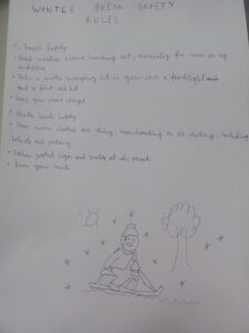 Klasa 3ALO tuż przed zimową przerwą wykonała krótki projekt międzyprzedmiotowy dotyczący bezpieczeństwa w trakcie ferii. Pierwszą część zadania wykonywali na godzinie wychowawczej a kolejną na języku angielskim. Uczniowie podali zasady bezpieczeństwa na drodze, jak dbać o zdrowie oraz jak zachowywać się na zewnątrz.
