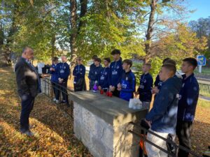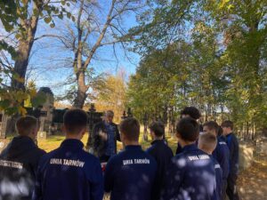 Lekcja historii odbyła się wśród mogił żołnierzy. dr Marek Smoła przybliżył uczniom treści związane ze szlakiem frontu wschodniego I wojny światowej. Szum drzew i jesienne słońce skłoniły uczniów do zadumy nad żołnierskim losem oraz nad wartością niepodległej Ojczyzny.