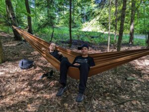 Oczywiście! Uczniowie uczyli się rozkładać hamak pomiędzy dwoma drzewami. To był idealny czas na relaks na łonie natury. Później zawodników czekała jeszcze gra terenowa. Uczniowie zostali podzielni na 3-4 osobowe grupy. Każdy zespół otrzymał krótkofalówkę, strój i farby do kamuflażu. Najpierw uczniowie mieli za zadanie odszukać 20 różnych punktów i jak najszybciej wrócić na miejsce zbiórki. Później zorganizowano podchody pomiędzy drużynami.