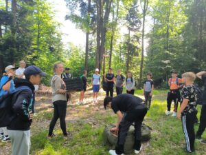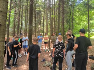 Dnia 28 maja 2024 r. nasi młodzi zawodnicy z wychowawcą Panem Markiem Sztorcem i opiekunem Panią Justyną Głodek wyruszyli na zajęcia w terenie. Na miejscu czekała specjalistka w tej dziedzinie: Pani Kaja. Uczniowie rozpoczęli dzień od zabaw integracyjnych, a następnie udali się do pobliskiego lasu. Za pomocą tradycyjnego krzesiwa uczyli się tworzyć iskry, a następnie, wykorzystując wacik, rozpalać ogień. Później próbowali znaleźć w lesie potrzebne surowce i wykonać to samo zadanie tylko z tego co oferuje las. Uczniowie dowiedzieli się, iż najlepszym materiałem będzie sucha kora brzozy, gdyż bardzo łatwo ją postrzępić i podpalić.