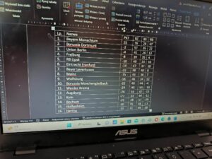 Po upływie tego czasu, uczniowie zostali połączeni w pary. Musieli podzielić się swoimi dotychczasowymi działaniami i wspólnie stworzyć tabelę dla wybranej ligi. Po umieszczeniu wszystkich zdobytych informacji w pliku, czekała na nich trudniejsza część zadania. Korzystając z wiedzy zdobytej na wcześniejszych lekcjach, obliczali różnice bramkowe oraz ile punktów „straty” ma każda z drużyn do pierwszego miejsca w tabeli. Tu przykład efektu finalnego jednej z grup: Bundesliga.