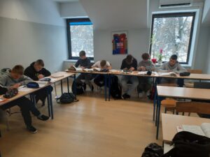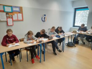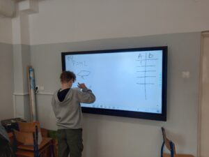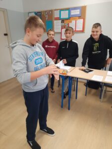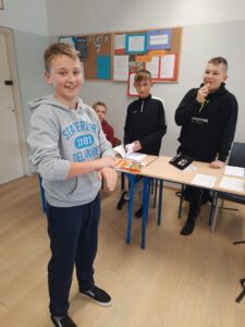 Podczas zajęć uczniowie rozegrali matematyczny mecz. Podzieleni na dwie drużyny przystąpili do pierwszego etapu lekcji, który polegał na rozwiązaniu zadań związanych z obliczaniem pola równoległoboku i rombu. Zadania o różnym stopniu trudności uczniowie mogli rozwiązywać samodzielnie lub grupowo, korzystając z pomocy koleżeńskiej. Uczniowie chętnie podjęli wyzwanie i sumiennie pracowali. Drugi etap lekcji rozpoczęli od rzutu monetą, czyli wylosowania drużyny, która rozpocznie zmagania. Naprzemiennie drużyny wskazywały u przeciwników osobę, która miała rozwiązać podane przez nich zadanie. Uczniowie szybko zauważyli, że wymienione czynniki mają znaczący wpływ na uzyskany rezultat. Chłopcy dyskutowali i wspólnie podejmowali przemyślane wybory.