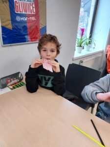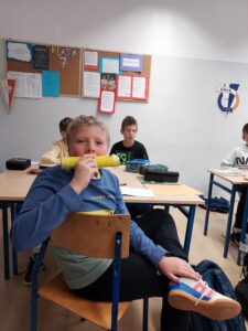 Następnie, z pomocą Internetu i różnych ogólnodostępnych przedmiotów, uczniowie prezentowali samodzielnie wykonane instrumenty, których źródłem dźwięku jest drgające powietrze. Razem z Panią Martą Cichoń stworzyli kompozycję muzyczną, w której głównymi „instrumentami” były przedmioty grające dzięki powietrzu.