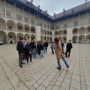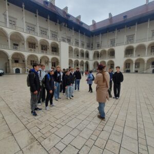 Za przekazanie wiedzy z zakresu historii i sztuki odpowiedzialny był pan przewodnik. Chłopcy rozpoczęli zwiedzanie od zamku na Wawelu, gdzie podziwiali przepiękny dziedziniec z arkadami. Następnie poznali historię Dzwonu Zygmunta oraz Katedry Wawelskiej wraz z pełną najwspanialszych dzieł sztuki Kaplicą Zygmuntowską, po czym udali się na spacer szlakiem romańskich i gotyckich kościołów.