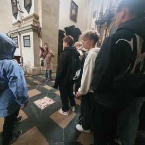 Pierwszy na liście zwiedzania był Kościół św. Andrzeja, który zachwycił wszystkich grubością murów i piękną amboną. Uczniowie dowiedzieli się przy okazji czym charakteryzuje się styl romański i udali się do sąsiadującego Kościoła Św. Piotra i Pawła. Tu podziwiali perspektywę i poznali historię tego miejsca. Następnie spacerując wśród kamienic ulicy Grodzkiej zgłębili wiedzę o architekturze i historii rynku krakowskiego oraz kościołów znajdujących się wokół niego. Słuchając ciekawych anegdot przewodnika, chłopcy dotarli do ulicy Franciszkańskiej, gdzie podziwiali piękno Kościoła Św. Franciszka z Asyżu, w którym znajdują się witraże stworzone przez Wyspiańskiego. Przy okazji uczniowie dowiedzieli się, gdzie znajduje się słynne okno papieskie na tej ulicy.