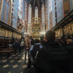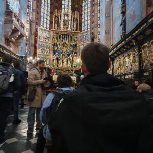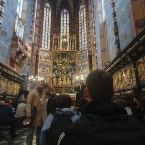 Wnętrze kościoła jest równie imponujące jak jego zewnętrzna architektura. Największą atrakcją jest słynny ołtarz Wita Stwosza, znanego rzeźbiarza z XV wieku. Ołtarz ten jest jednym z najważniejszych dzieł sztuki gotyckiej w Europie. Przy okazji pan przewodnik omówił cechy stylu gotyckiego, które zobrazował oprowadzając po tym niezwykłym kościele.