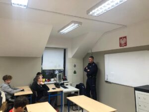 Nie zabrakło również informacji o szkodliwości narkotyków i dopalaczy, konsekwencji prawnych związanych z ich posiadaniem. Pan Dzielnicowy omówił także zagrożenia wynikające z korzystania z Internetu i portali społecznościowych, w tym uzależnienia od gier.